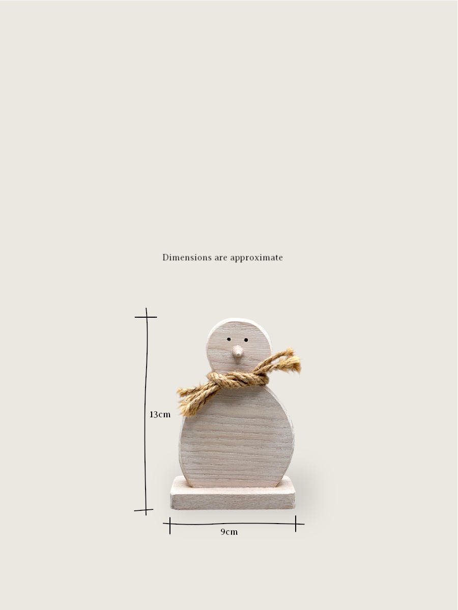 This  cute little Christmas snowman is the perfect addition to your festive decorations. Crafted from premium Ash wood, it boasts a limed finish that highlights its natural grain, giving it a charmingly rustic appeal. The snowman has a  jute scarf, adding a cozy and timeless touch to its design.