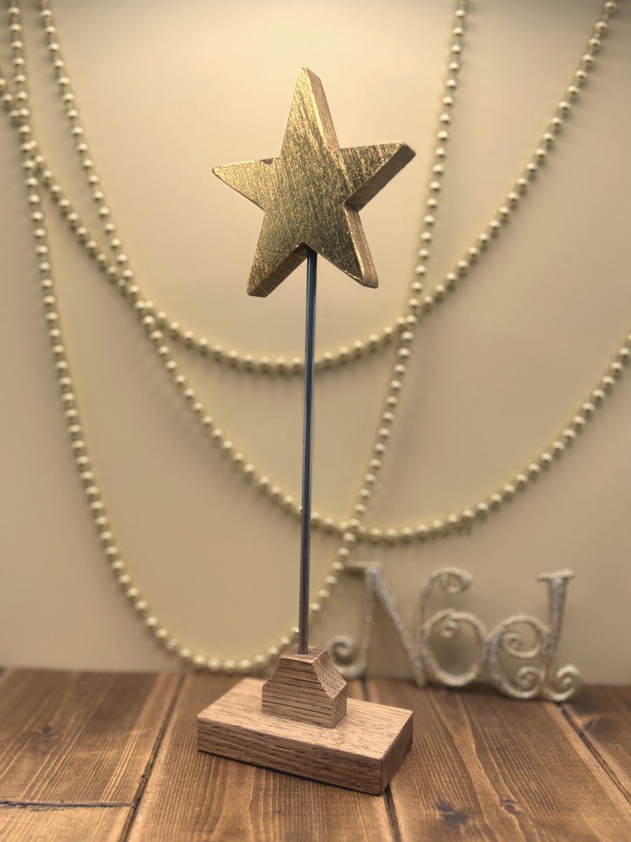 The star elegantly floats on a sturdy metal stem, which is securely mounted atop a solid wood base, providing height and presence. This unique decor item stands out beautifully on its own or can serve as a stunning feature decoration. Additionally, it makes for an eye-catching centerpiece on your Christmas table.
